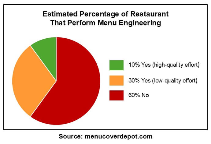 A frequent and complex issue with this approach is that items that are highest in gross profit typically are higher priced menu items that almost always fall within the higher end of the food cost percentage scale. Operators who believe that a low food cost percentage is more important than gross profit tend to promote menu items carrying a lower food cost percentage. Unfortunately, these items are typically the lower priced items on a menu and correspondingly are lowest in contribution margin. Therefore, promoting low food cost items often results in a lower average check and lower gross profit. It is, however, important to note that low food cost and high gross profit are not mutually exclusive. It is interesting to note, however, the percentage of restaurants that self-report using menu engineering totals around forty percent as depicted in the following pie chart.