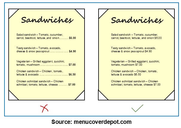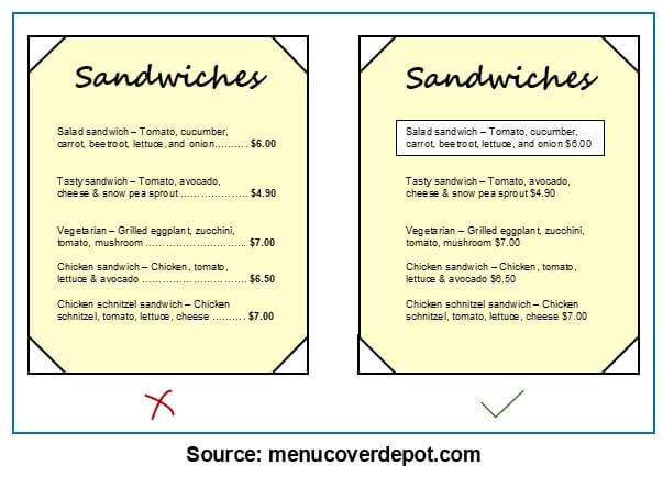 The website menucoverdepot.com emphasizes the following menu design techniques: